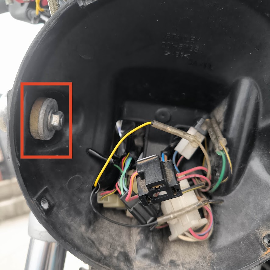 左右1本づつ12ミリのスパナで押さえつつ、六角で緩めます。メーターハーネスがつながっているものは外しておきます。