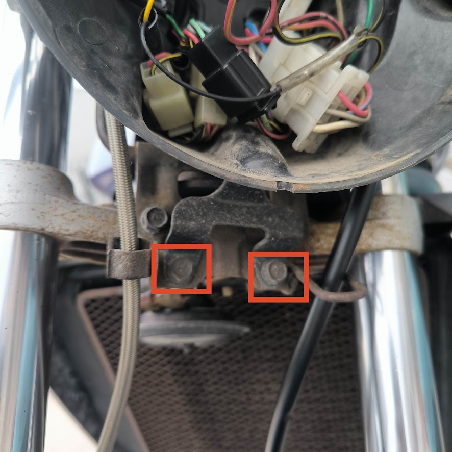 下のボルト2本も外します。これでヘッドライトカバーをずらすことができるはず。