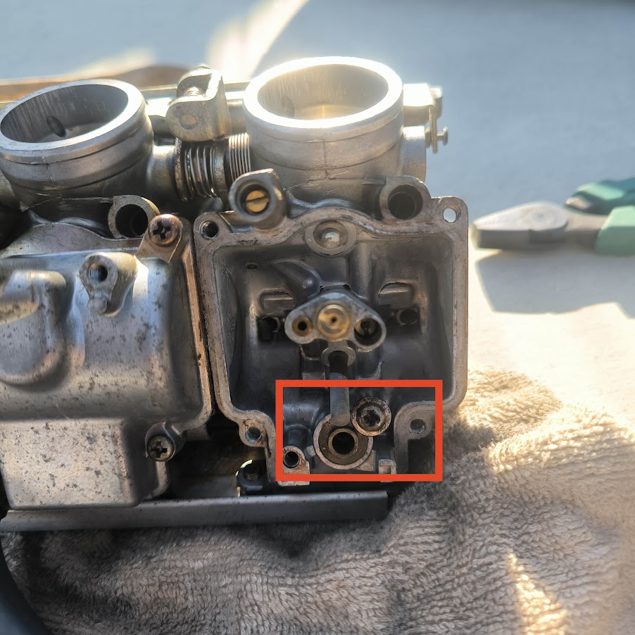 フロートバルブの交換はすんなり行きましたが、問題はバルブシート。こいつもネジを緩めて圧入されているバルブシートをペンチでひっこ抜いて新しいものを入れるだけですが、なぜかこのネジがことごとくなめており、外すのに苦戦、4本中3本なめてました。