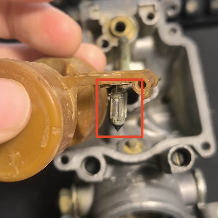 フロートにぶら下がっている小さな部品。右側の写真わかりずらいですが、痕がついている部分があると思います。これはバルブシートのあたり面で、少しづつ摩耗していき最終的にはガソリンをせき止めることができなくなりオーバーフローにつながります。高い部品でもないので、せっかくキャブをおろしたなら交換してしまいましょう。アマゾンでも安くで売ってます。4気筒分で1300円ぐらい。