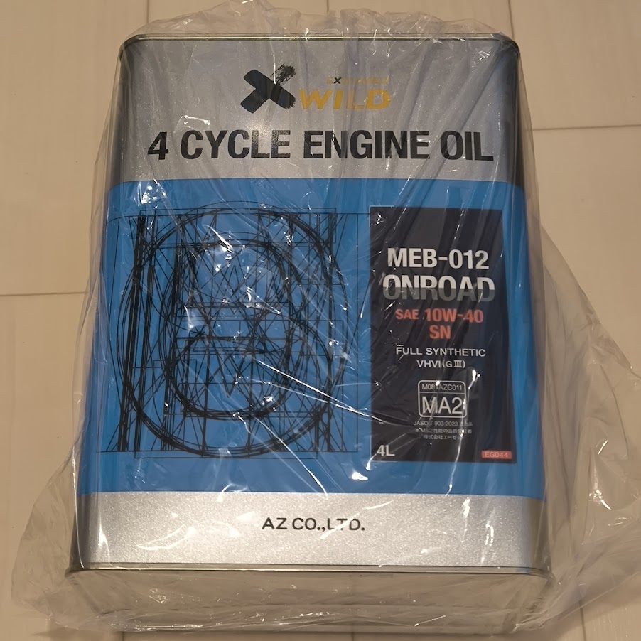 使用するエンジンオイルはAZの粘度10w-40のもの。4Lで3355円(838円/L)と安い割にAPI規格のSNを取得しているオイル。8年以上前からこのオイルしか使っていません。