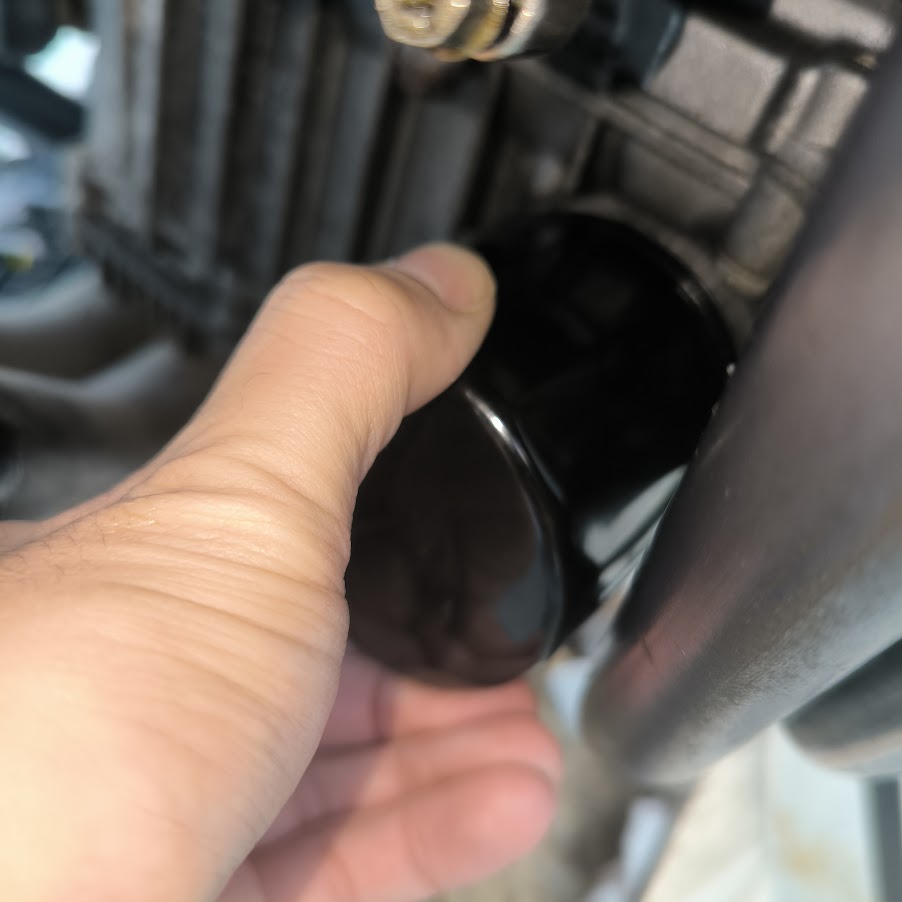 オイルフィルターレンチをはめて回すとフィルターが取れます。フィルターを外した際、エンジンオイルが外したところから垂れてきますが、大きめの廃油処理ボックスを使用すれば地面に垂れません。