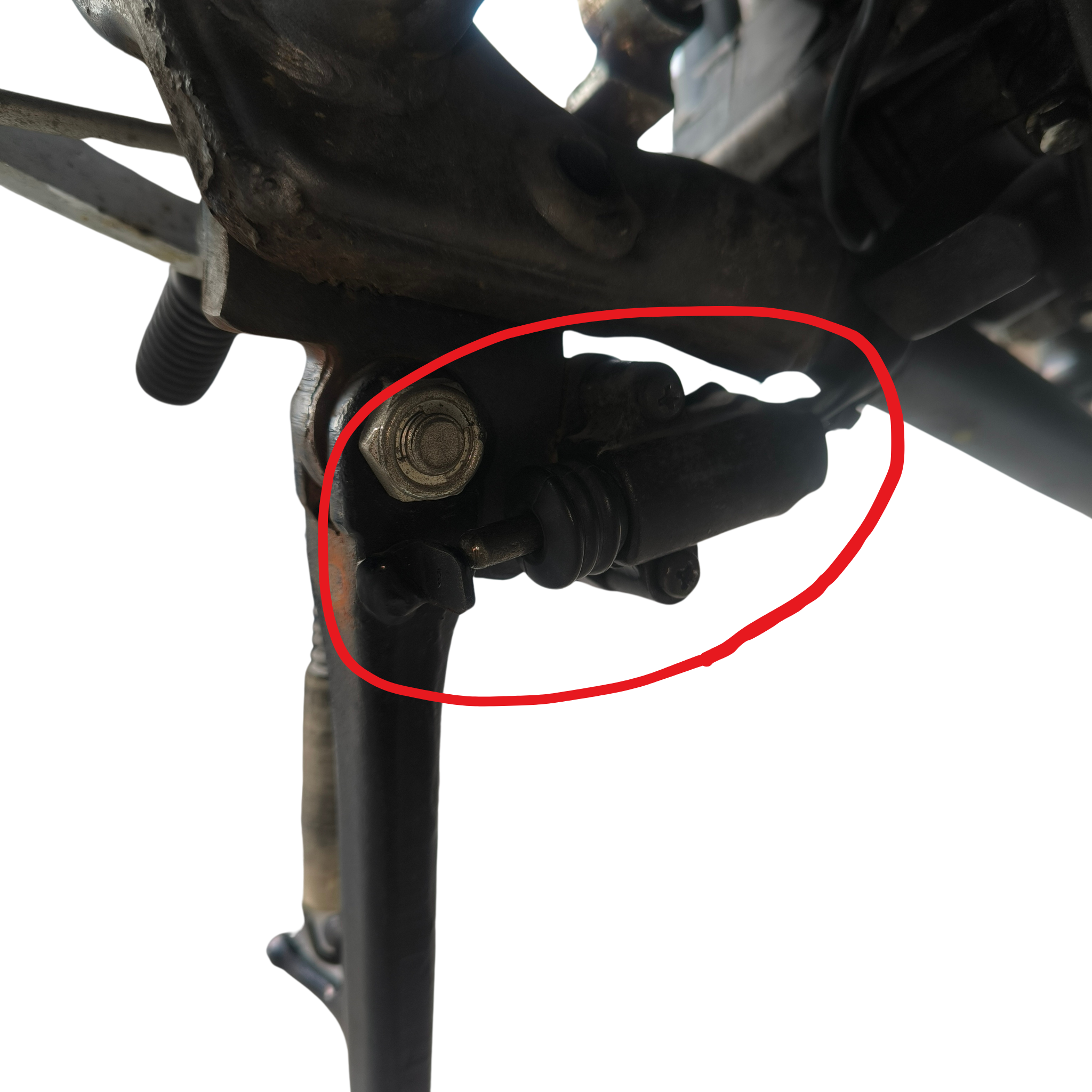 サイドスタンドセンサーは裏側の物です。見えにくいですがネジ2本で裏側から固定されており、ご丁寧にネジロック剤まで使用されているので、外すのに難儀しました。舐めないよう慎重に取り外したいところ。