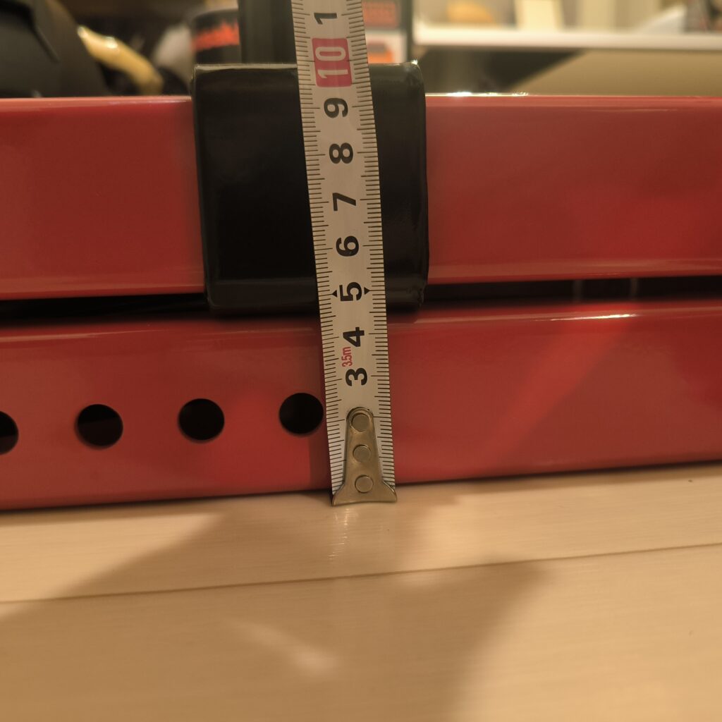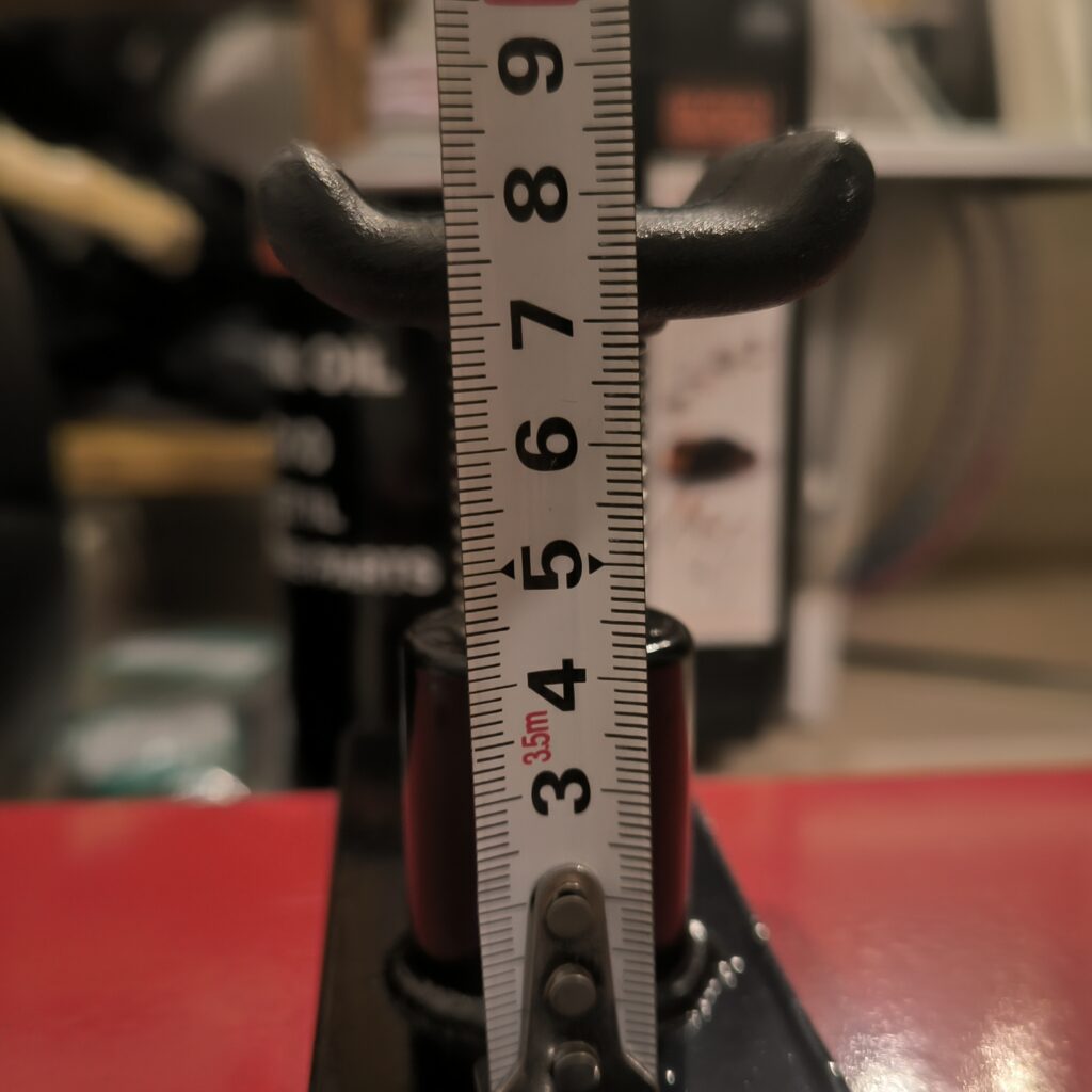一番下まで下げた状態の高さは約10センチ、ジャッキからマウントのクリアランスは約8センチほどです。