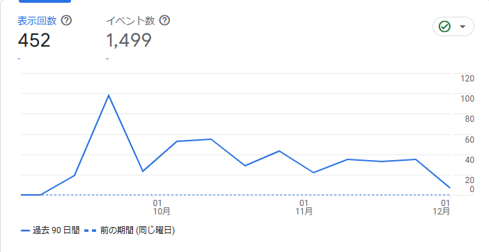 PVはグーグルアナリティクスの表示回数として出してます。表示回数は下記の通り、2024/12/3現在452となってます。見てくださった皆様ありがとうございます。10月よりも以前のものに関しては自分で見たものも表示されているので、多少多く数字としては出てしまっています。