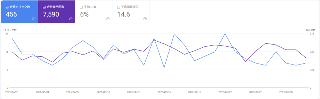 上の画像はサーチコンソールからの検索表示回数のデータです。表示回数は先月に比べ増加しましたがクリック数はその増加に伴わない数値となっています。
