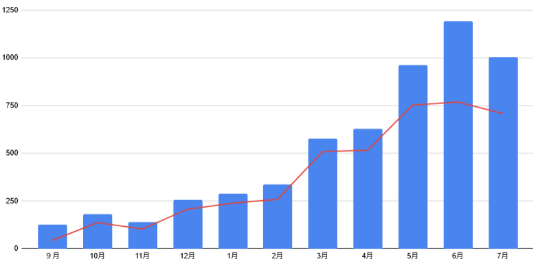 グラフにしてみても7月に落ち込んでいるのが見て取れます。PV数では何とか5月をなんとか上回っていますが、ユーザー数に関しては下回っています。
