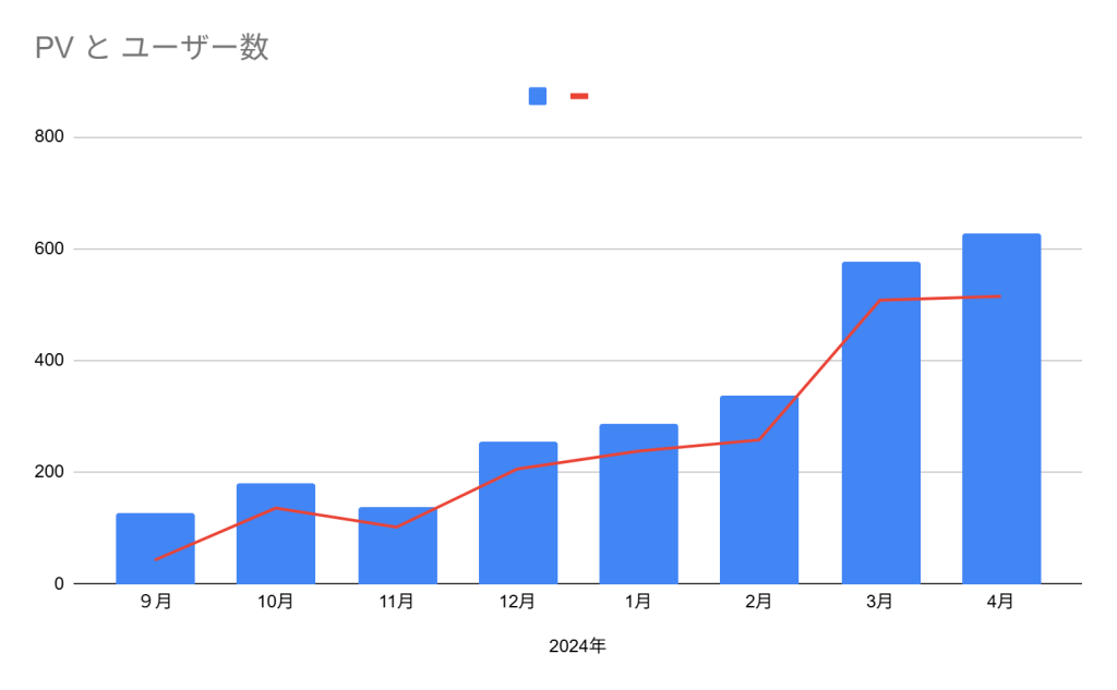 ちなみにユーザー数とPV数を可視化するとこのような感じになりました。棒グラフがPV数、赤い線がユーザー数になります。こう見ると右肩上がりで順調そうに見えるので、今後も頑張っていきたいと思います。応援よろしくお願いします。