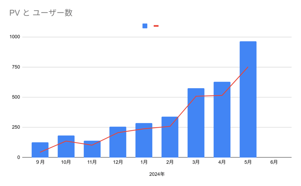 上記画像はブログを開設してから、現在に至るまでのPV数とユーザー数のグラフになります。ありがたいことに今のところは右肩上がりに成長しており、うまくいけば今月には月間1000PVに到達しそうです。