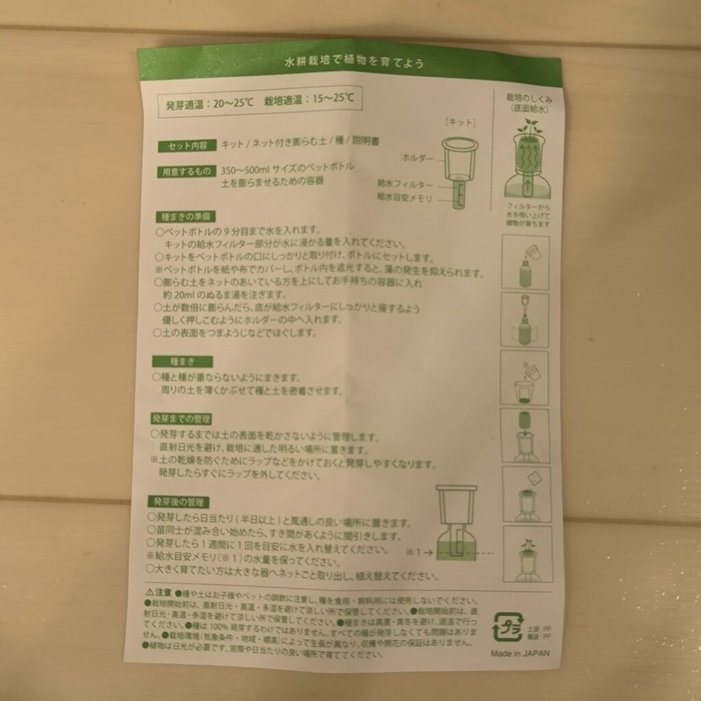 開封するとペットボトルに取り付けるフタ、種、土が入っておりすぐに栽培が始められるように一式そろっていました。