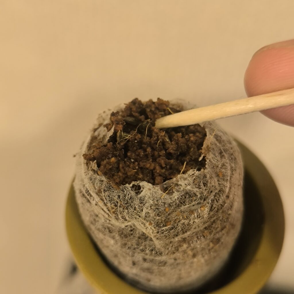 見えずらいですが種がしっかり埋まらなかったので、つまようじでほぐしている図です。