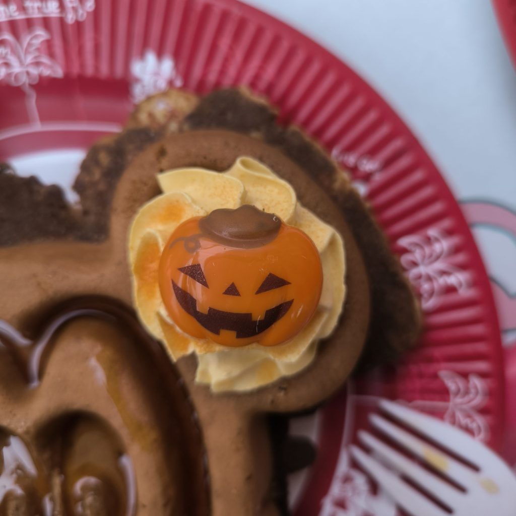 ディズニーランドに入園した際は必ず、絶対に、何がっても食べるべき定番フードの一つ!外はカリカリ、中はモチットした超絶美味なワッフルです。2024年9月1日~2024年11月7日まではハロウィン仕様になっています。ホイップはパンプキンホイップ、メープルは通常通りの後かけスタイルです。溝にたまるようにメイプルシロップをかけて食べましょう。