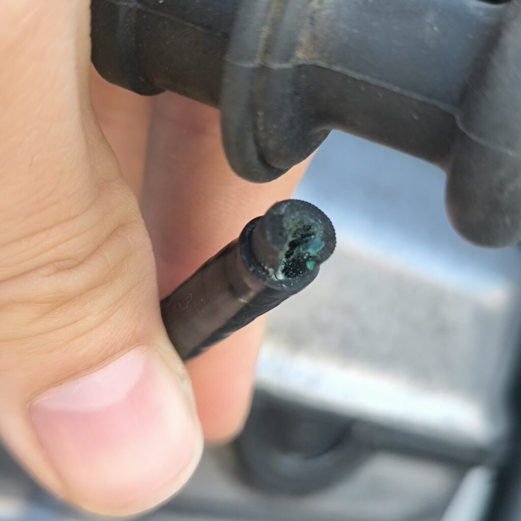 せっかく外したんだったら確認しておきたいプラグコードとキャップの接点。青錆により侵食されていました。