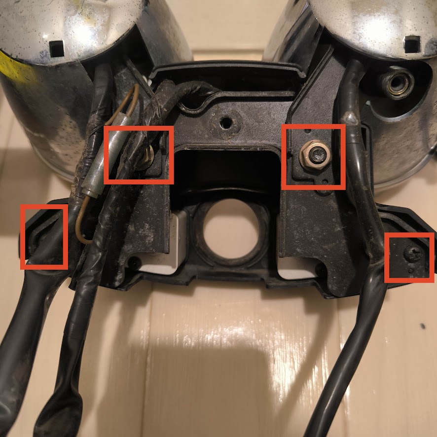 カバーを取るとスピードメーター、タコメーターが固定されているナットが見えるので、こちらを緩めると外すことができます。(上部2カ所)下の2カ所を外すとインジケーターのウェッジ球にアクセスできます。