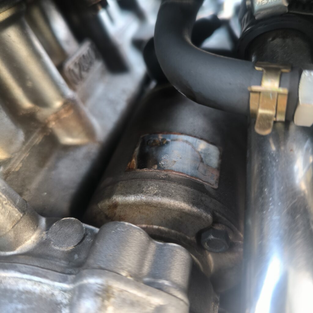 いろいろなことを言い訳に交換せず放置していましたが、ガソリン漏れの影響でエンジンのクリア塗装が一部剥げていました。