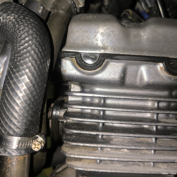 タペットカバーからのオイル滲みがないかも確認を。写真はバリオスのものですが、この車種でタペットカバーからオイル滲みを起こしていない車両を見たことがありません。。。空冷や低年式の車両であれば仕方ない部分でもありますが、走行に支障が出るほどの漏れは別。後々整備が必要になるかもしれません。