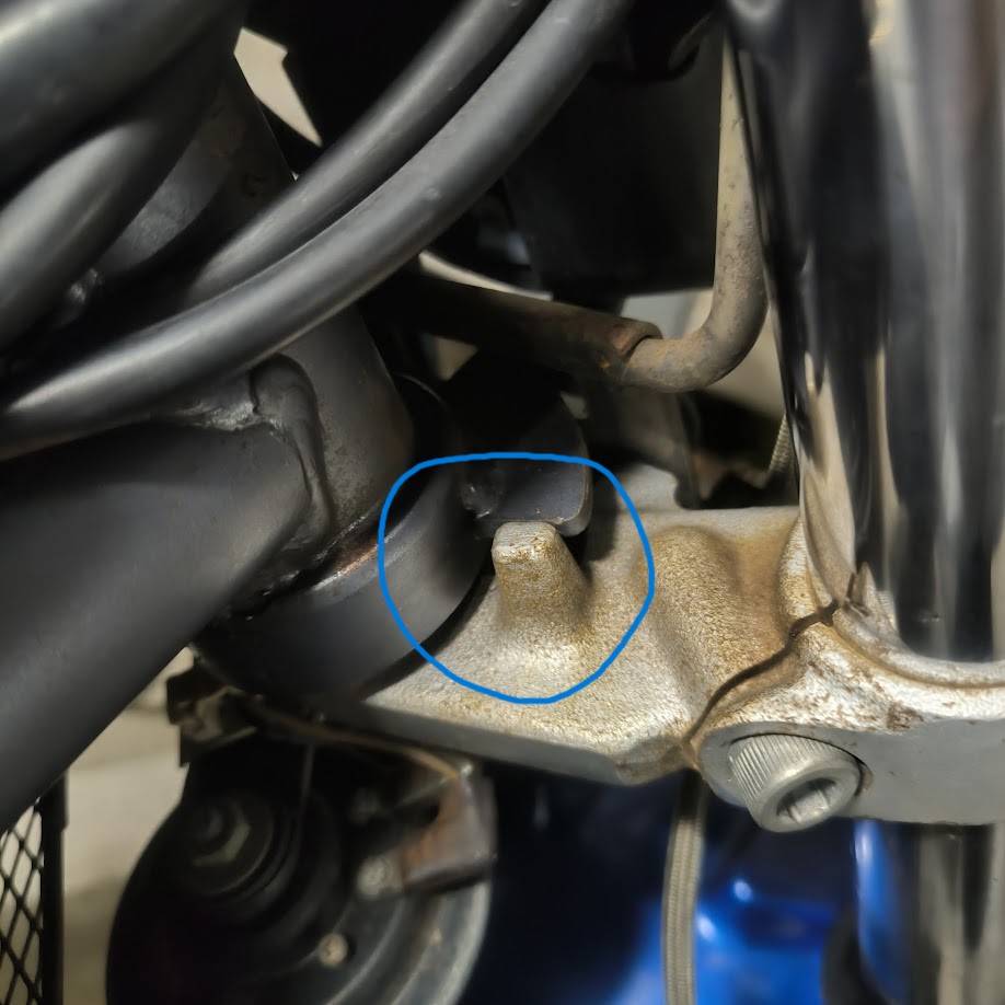 丸く囲ったところはハンドルストッパー、ここに激しい打痕もしくは破損しているなどがあれば、過去に激しく転倒した可能性があります。破損しているとなると修理しずらい箇所になるのでおのずと費用は高額に、もちろんリセールにも影響あり。必ず確認しておきましょう。