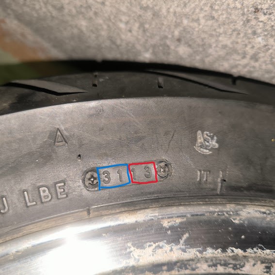 タイヤの鮮度は要確認。タイヤには製造年と週の記載があり、写真の赤で囲っているのが製造年、青が週。この場合だと2013年の31週に製造されたものということ。あまりにも古いタイヤだとあまりメンテナンスされていない車両の可能性があります。