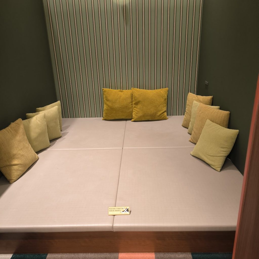 内装もおしゃれで靴を脱いでゴロゴロできるスペースやカーテン付きのスペースも。私は身支度を整えるのに使いました。