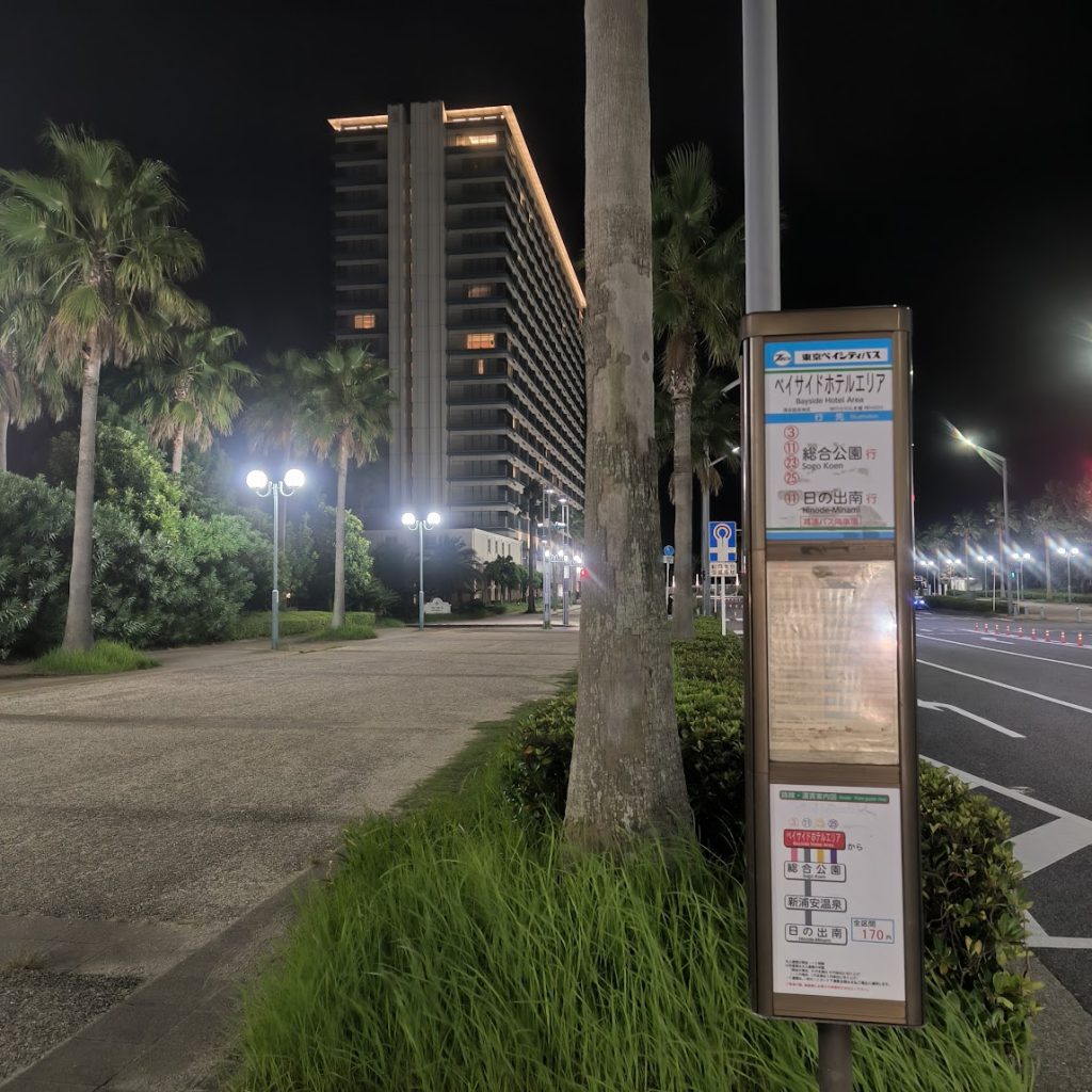 ここのバス停で降りることができます。信号一つ渡ってすぐの場所が1955東京ベイ