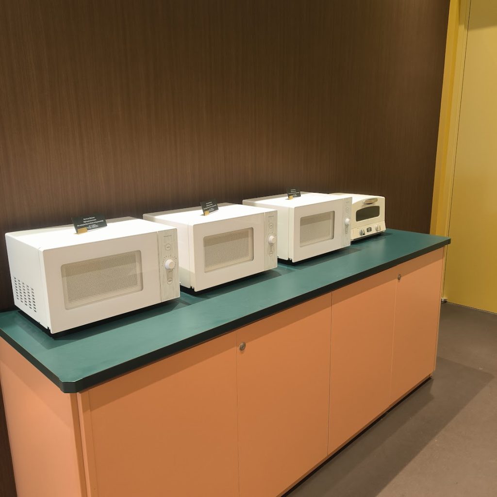ウォーターサーバー、電子レンジもあるのでコンビニで買ったカップ麺や、食べ物を温めて食べることもできる。ウォーターサーバーももちろん無料。