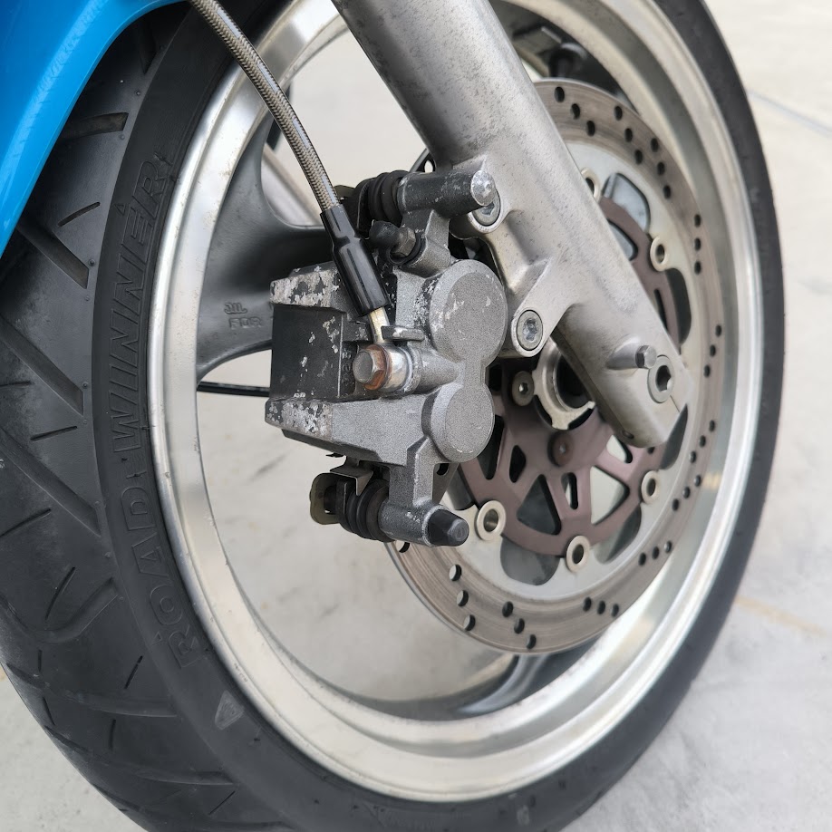 問題はリア。これがなかなか効かない代物で、減速はフロントで、リアは姿勢保持ぐらいの為に使ってね!と割り切ったブレーキ。スポーツバイクはほぼそんな感じだと思いますが、もうちょっと強くても良い気がしますが私だけ?
