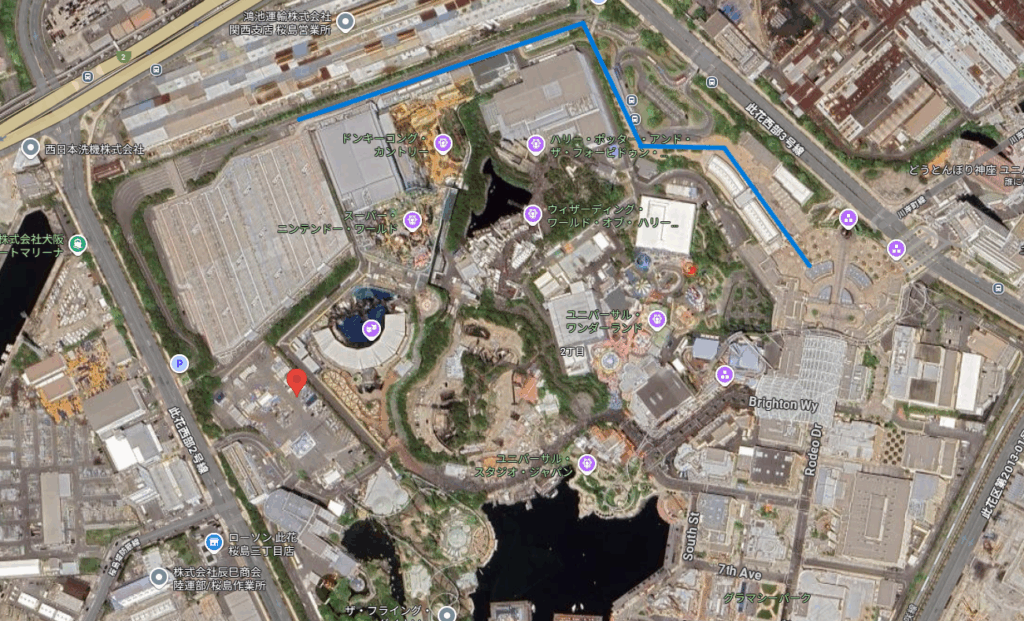 歩く距離はユニバーサルシティ駅からの距離とほぼ変わらないので、公式の駐車場よりも歩く時間を短縮できます。