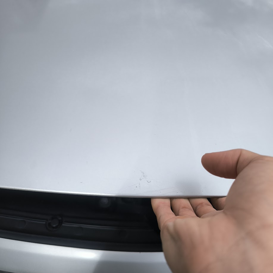 ボンネットを閉める際、手で押したりしていませんか?押すとへこみの原因にもなるので、写真のように少しの高さから落として、重力を利用して閉めると凹ませる心配はありません。落とす高さの目安は20-30センチぐらい。雑に見えますがこれが正解。
